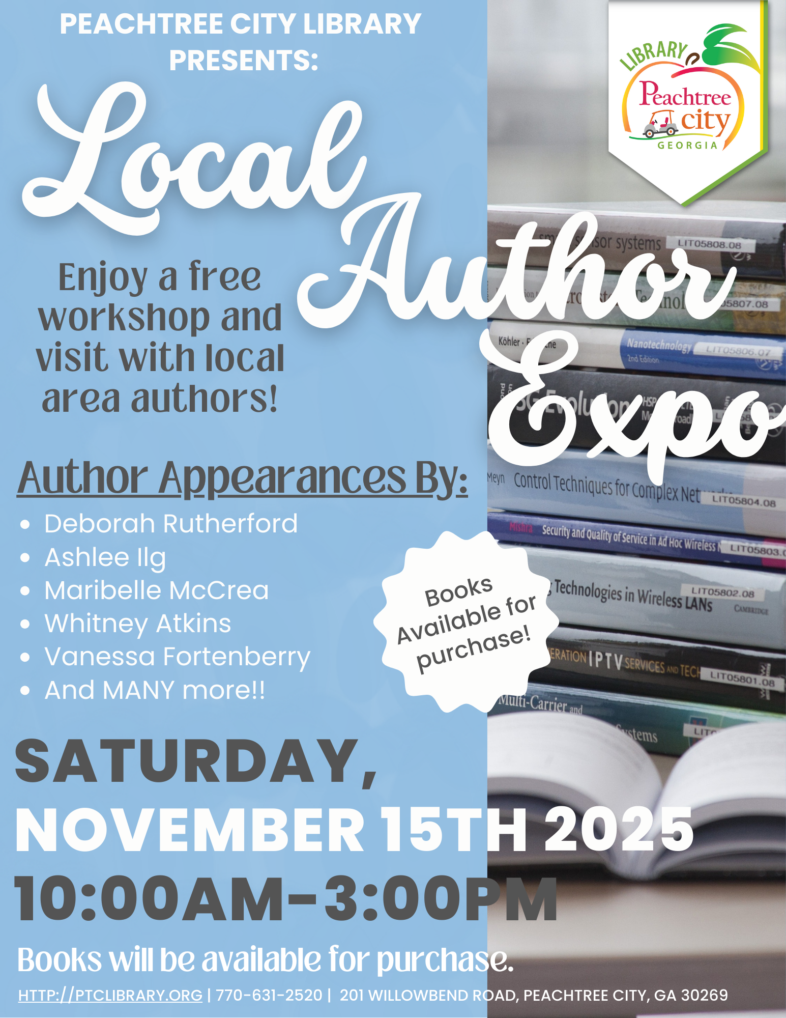 But in the meantime, in between time, I’m poppin’ in to let you know that I will be participating in the Peachtree City Library’s 2025 Local Author Expo THIS SATURDAY so if you live in the metro Atlanta area, please stop by…